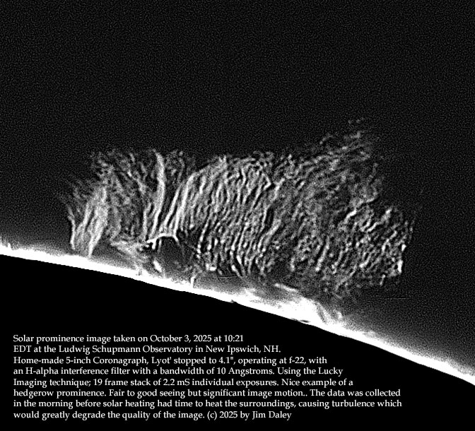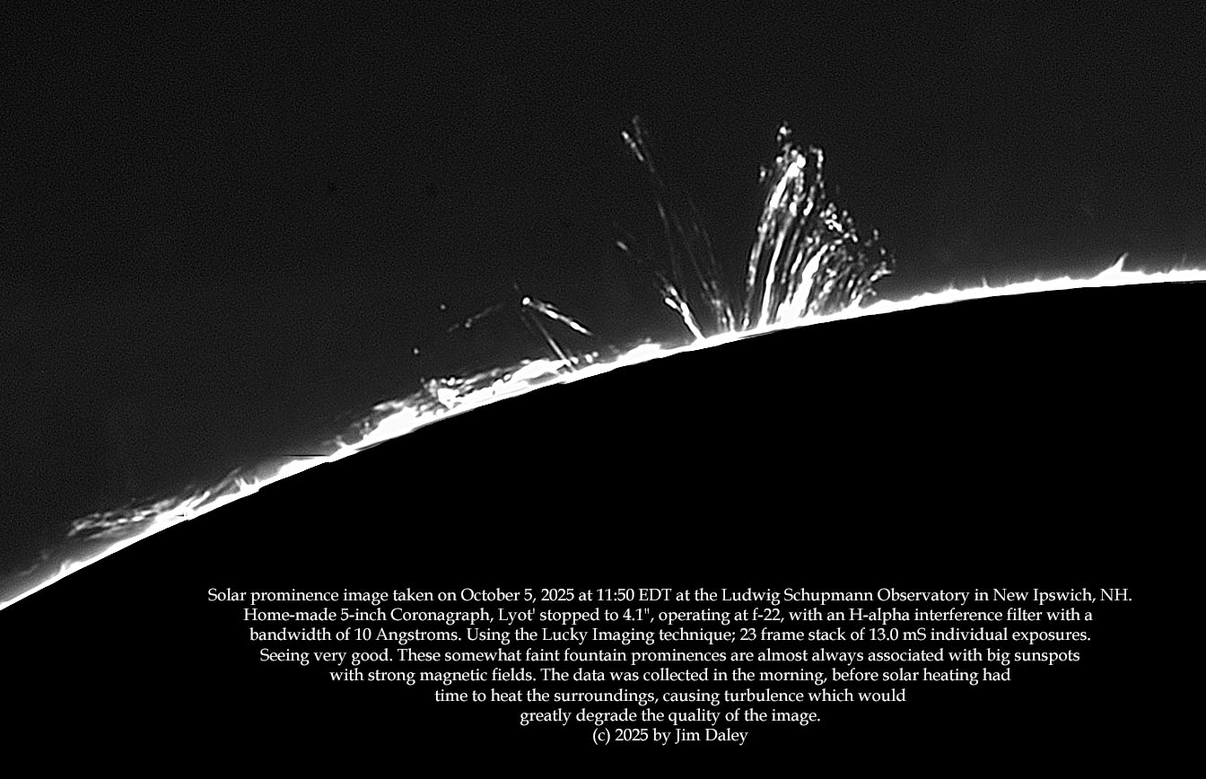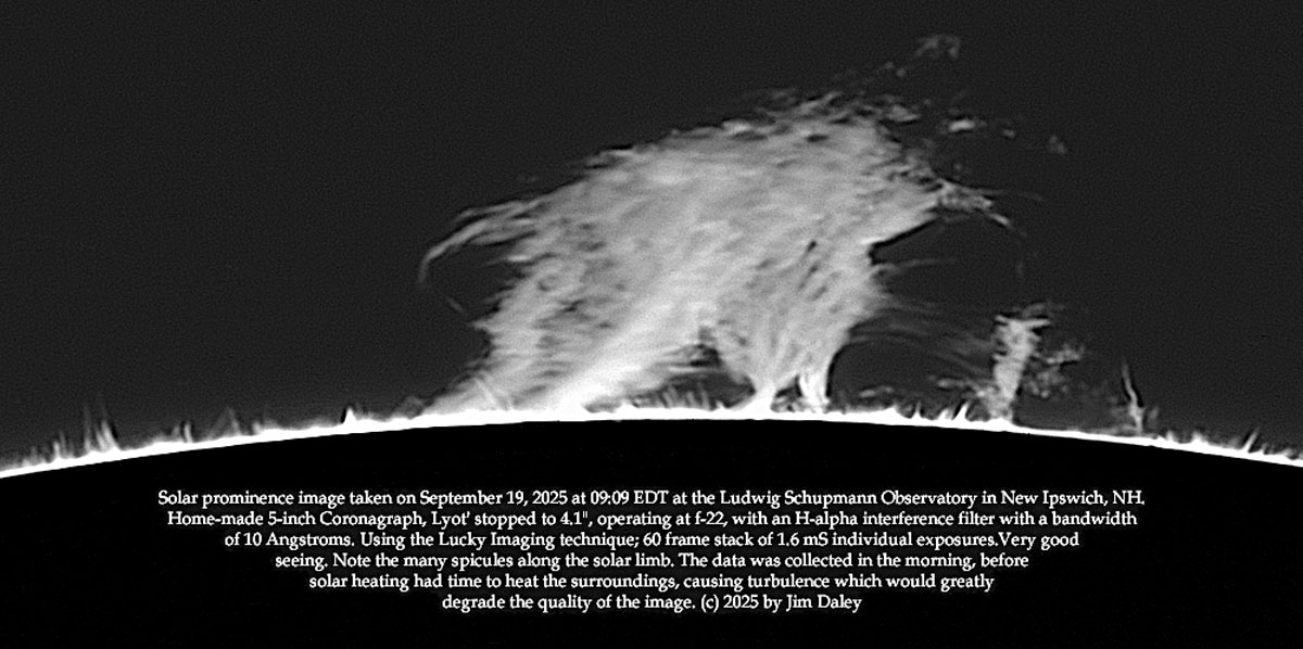 Having completed a coronal imaging project of the red coronal line at 6,374 Angstroms (see Reflector article “Imaging Coronal Fine Structure Without an Eclipse” PDF), I reinstalled the H-alpha filter (6,563 Angstroms) into my 5” f-22 coronagraph (see Reflector article “My Last Coronagraph” PDF). The images below were taken during September and October of 2025. Coronal imaging will resume in the spring of 2026, using the near infrared light of the FeXI line at 7,892 Angstroms. I thank Thomas Spirock, of the Springfield Telescope Makers, for adjusting the images for best presentation and adding the captions.