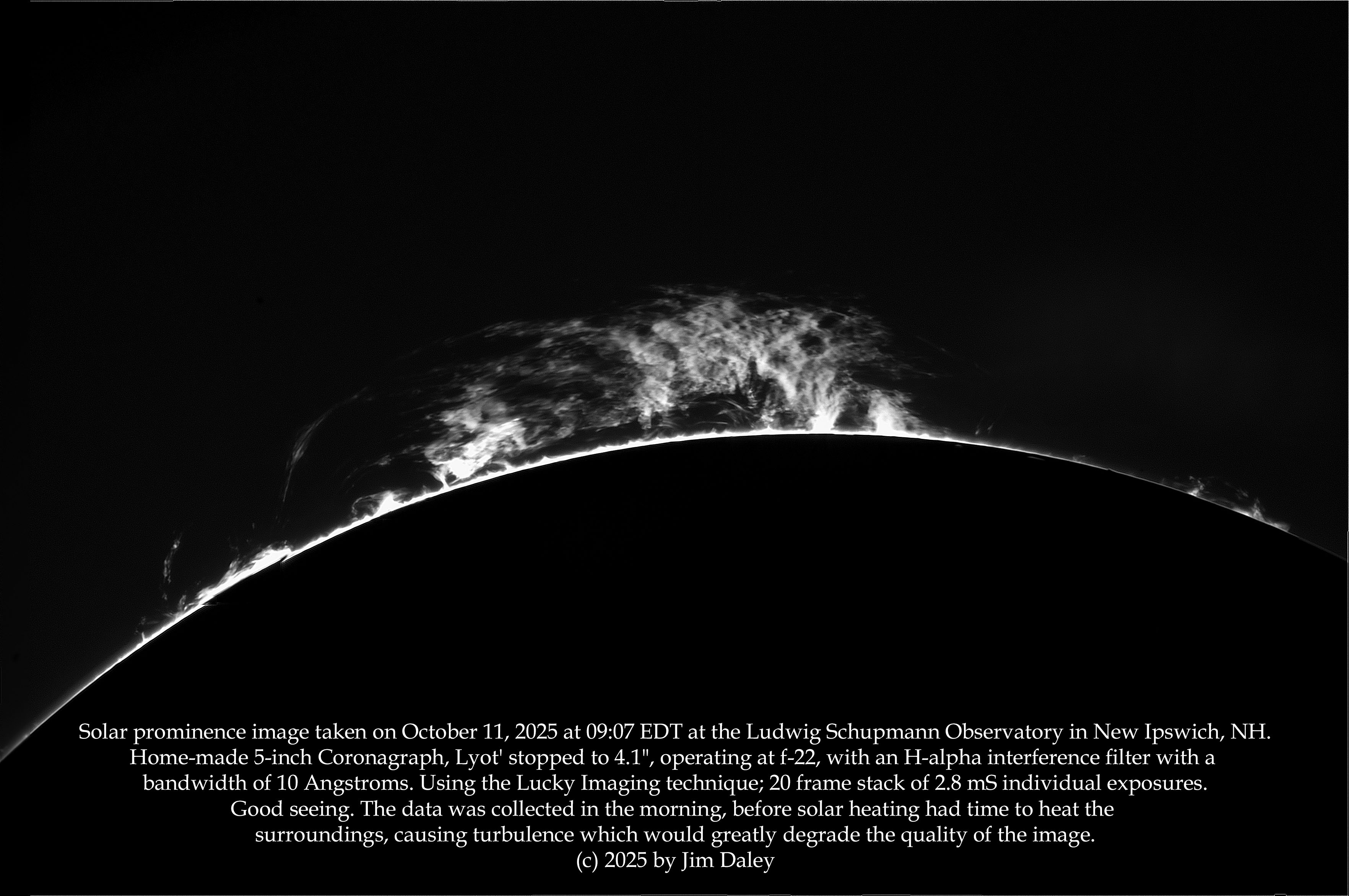 Having completed a coronal imaging project of the red coronal line at 6,374 Angstroms (see Reflector article “Imaging Coronal Fine Structure Without an Eclipse” PDF), I reinstalled the H-alpha filter (6,563 Angstroms) into my 5” f-22 coronagraph (see Reflector article “My Last Coronagraph” PDF). The images below were taken during September and October of 2025. Coronal imaging will resume in the spring of 2026, using the near infrared light of the FeXI line at 7,892 Angstroms. I thank Thomas Spirock, of the Springfield Telescope Makers, for adjusting the images for best presentation and adding the captions.