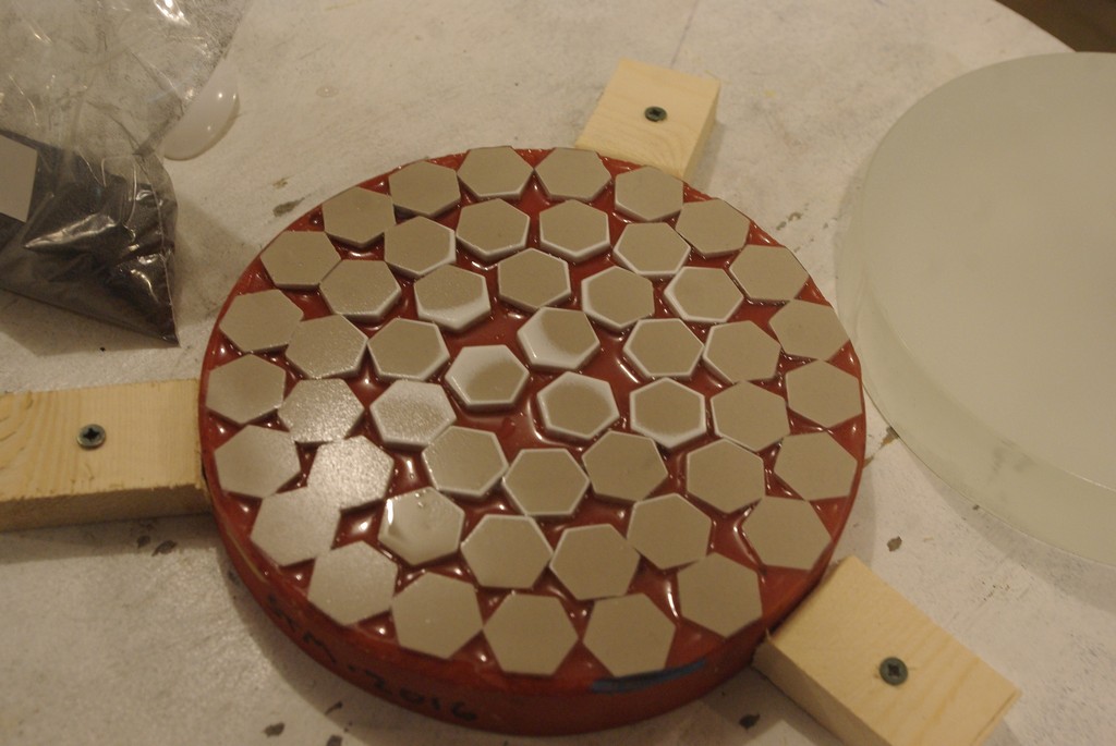 When hogging out the curve with Mirror on Top, the center of the mirror is offset to overhang the edge of the tile tool. You can see the results of this here: the outer tiles, which see more grinding action, are worn down significantly while the central tiles still show some of their original glaze color.
