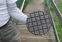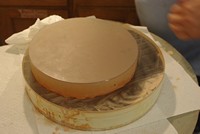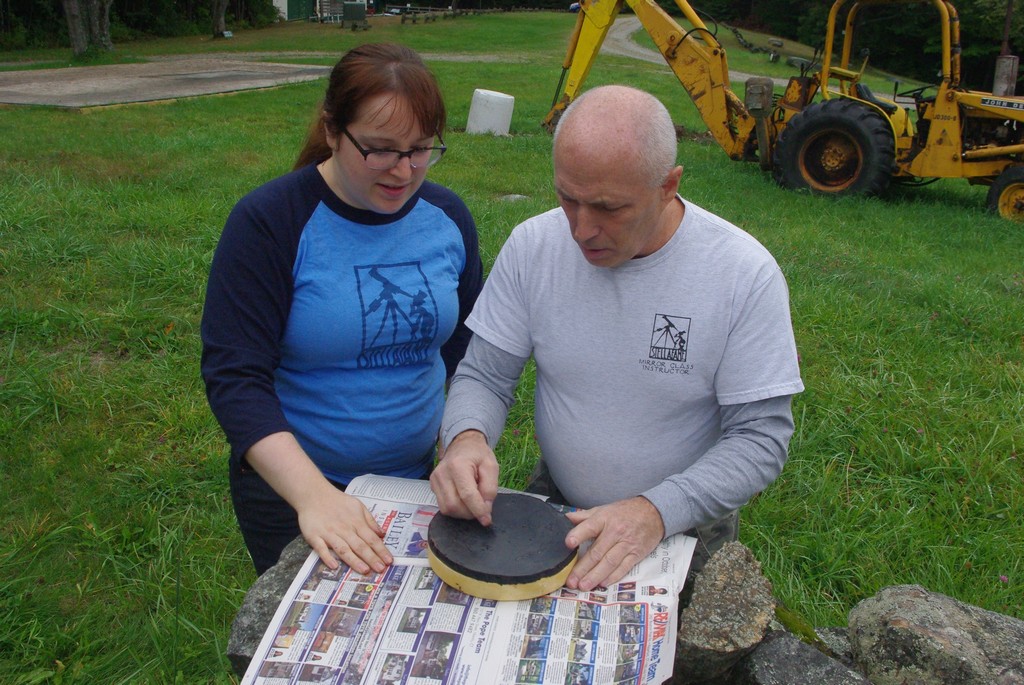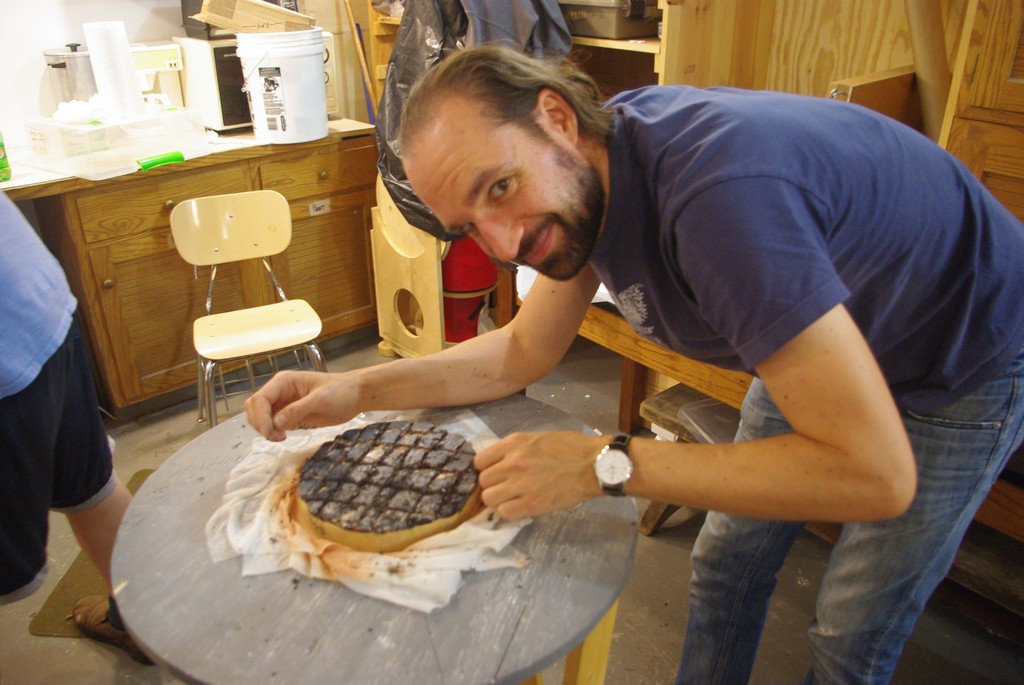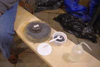 Dave cutting channels in his new pitch lap. We work outside to keep the gazillions of sticky pitch shards off the floor.