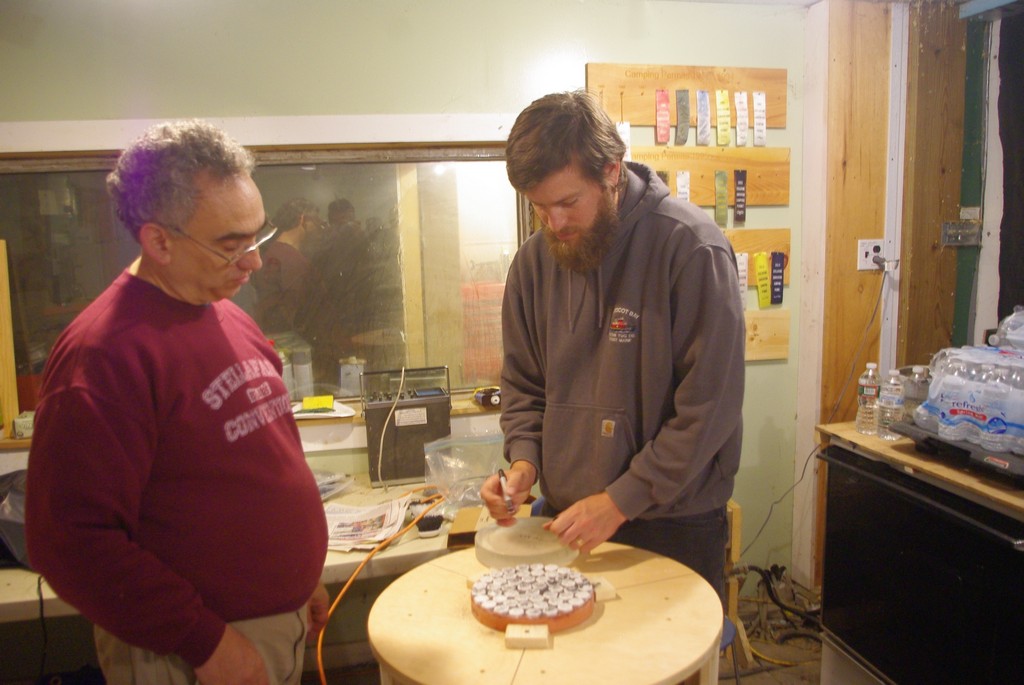 Fran and crew spent a busy sawdust filled day making up a batch of a dozen new Parker grinding barrels. These neat inventions by club member Dick Parker are a terrific way to have a light portable yet strong work surface.
